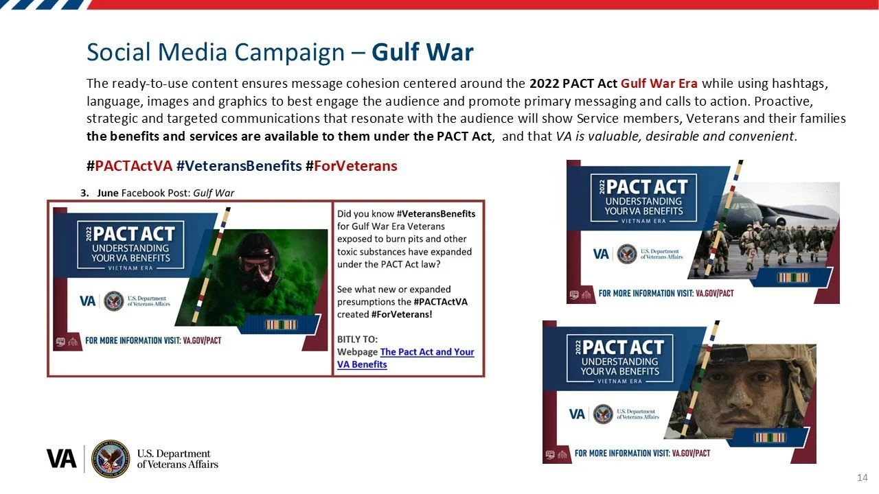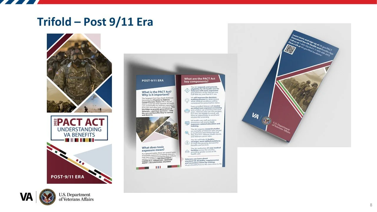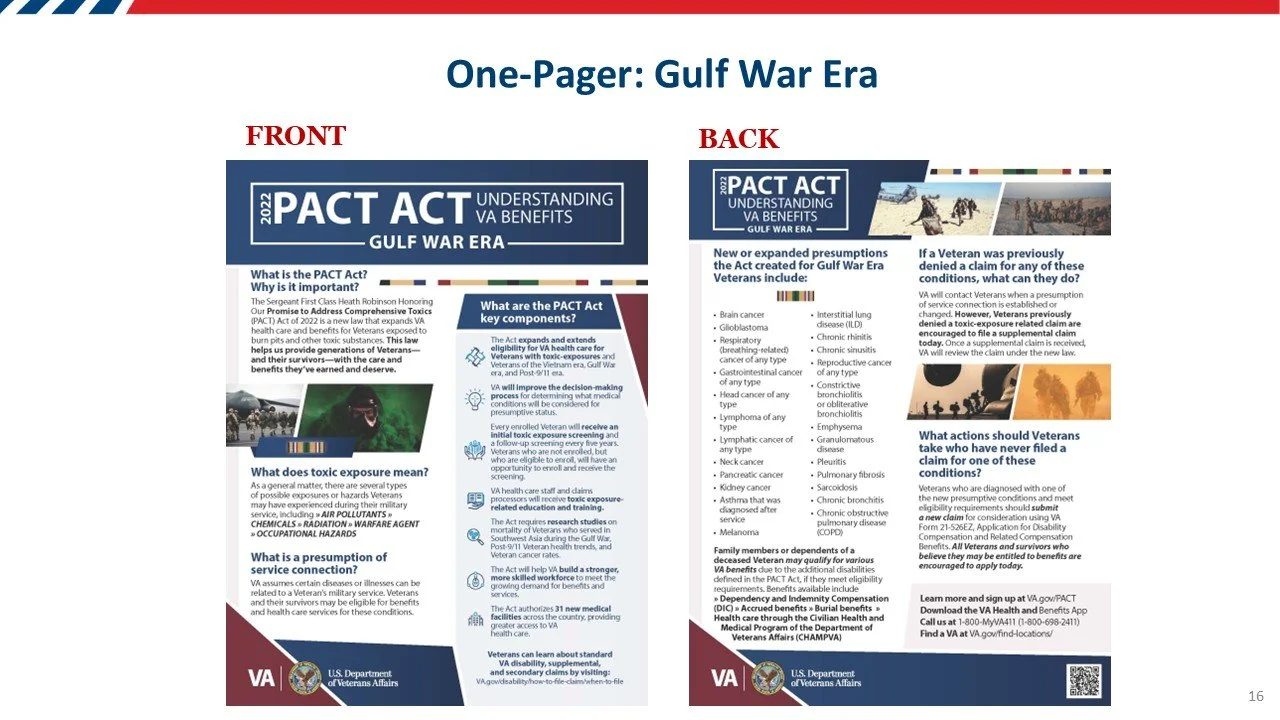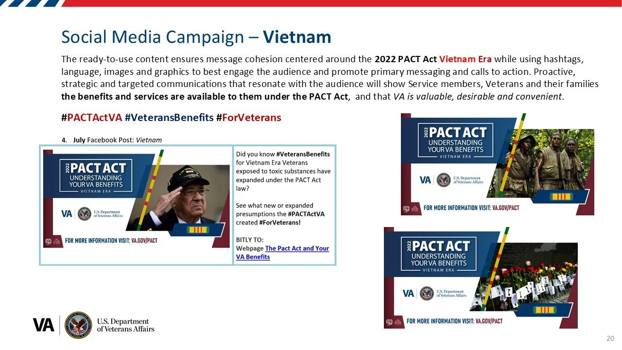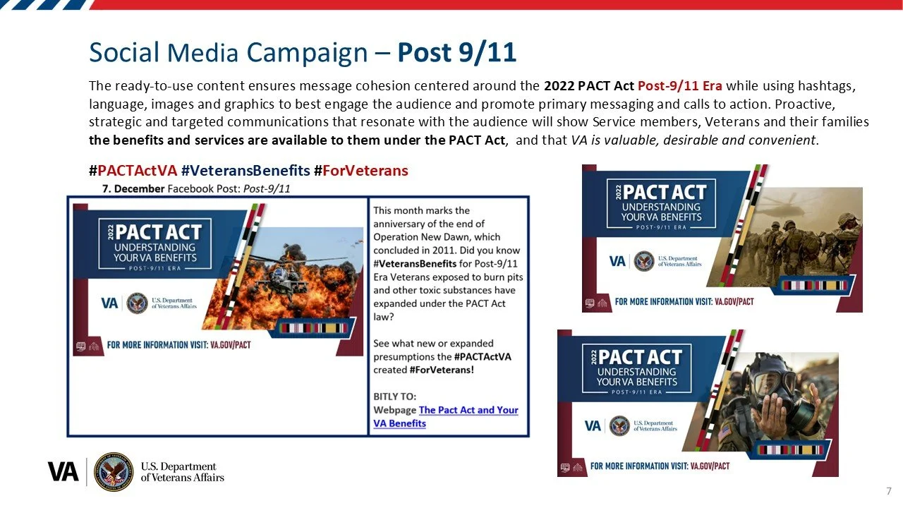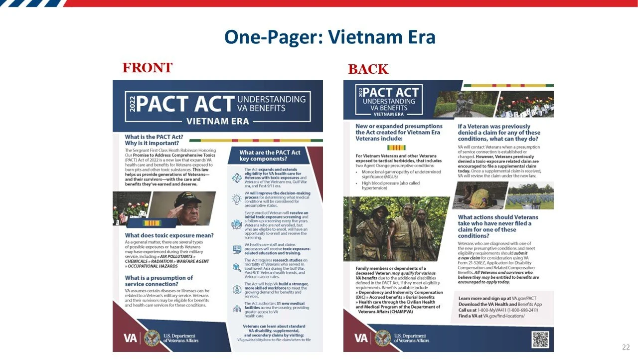 I led the strategic communications plan* and executive briefing to support the rollout of the Sergeant First Class Heath Robinson Honoring our Promise to Address Comprehensive Toxics (PACT) Act—a law that expands health care and benefits for Veterans exposed to toxic substances. I turned complex legislation into clear, targeted messages for Service members, Veterans, and their families from the Vietnam, Gulf War, and Post-9/11 eras. I created social media content, print materials, and outreach tools to help these audiences understand and access their VA benefits. The strategy delivered one clear message: VA is valuable, desirable, and convenient.