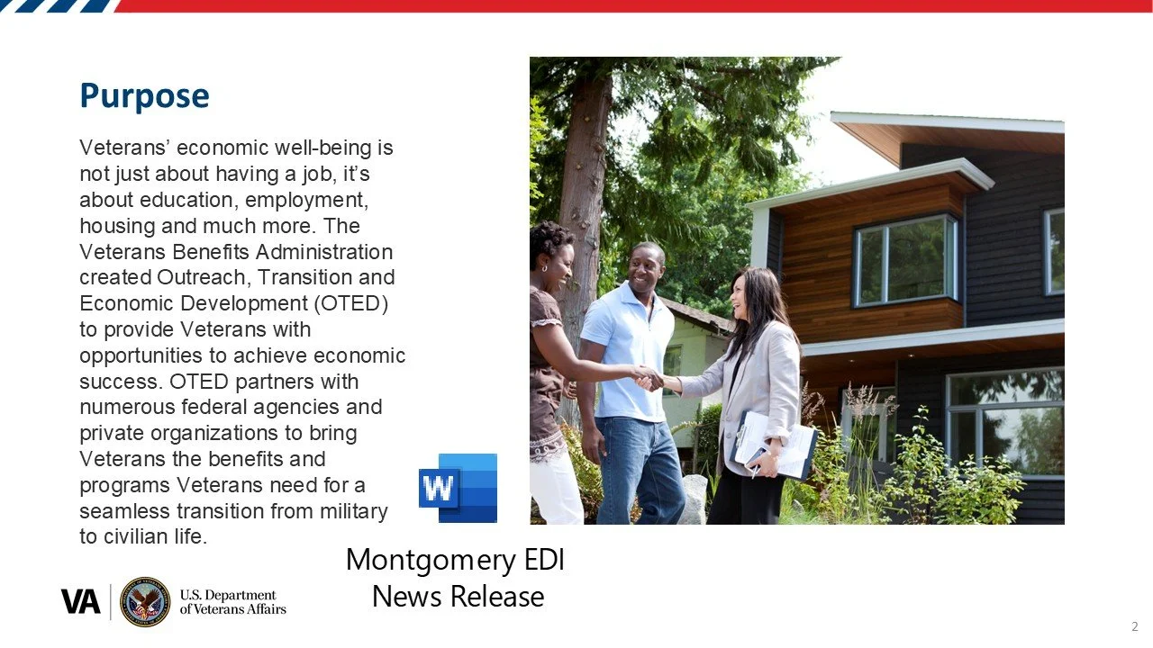 I led the strategic communications plan* and executive briefing for the Montgomery Economic Development Initiative—an outreach effort designed to help Veterans in Alabama access benefits, find employment, and connect with resources that support their economic well-being. The plan addressed barriers to access, such as mental health challenges, transportation issues, and lack of awareness. I developed messaging, outreach strategies, and materials tailored to Veterans across the Vietnam, Gulf War, and Post-9/11 eras. The communications reinforced a clear message: VA is valuable, desirable, and convenient.